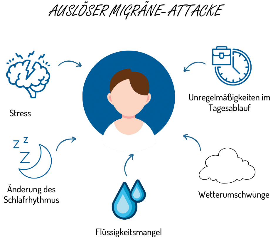 Die Ursachen für die Entstehung von Migräne sind noch nicht vollends geklärt. Es gibt verschiedene Theorien: Unter anderem wird vermutet, dass Entzündungen im Hirn hierbei einen Rolle spielen könnten. Eine andere Theorie wiederum vermutet, dass eine Störung des Energiestoffwechsels in den Mitochondrien vorliegen könnte. Mitochondrien werden auch “Kraftwerk der Zelle” genannt, denn sie sind dafür zuständig, dass ausreichend Energie in Form von ATP (Adenosintriphosphat – ein Molekül, das Energie in den Zellen bereitstellt), gebildet wird. Zu unterscheiden von Ursachen einer Migräne sind die Auslöser einer Migräne-Attacke. Zu den Auslösern einer Migräne-Attacke zählen unter anderem Stress, das Wetter, veränderte Schlafgewohnheiten und Flüssigkeitsmangel.