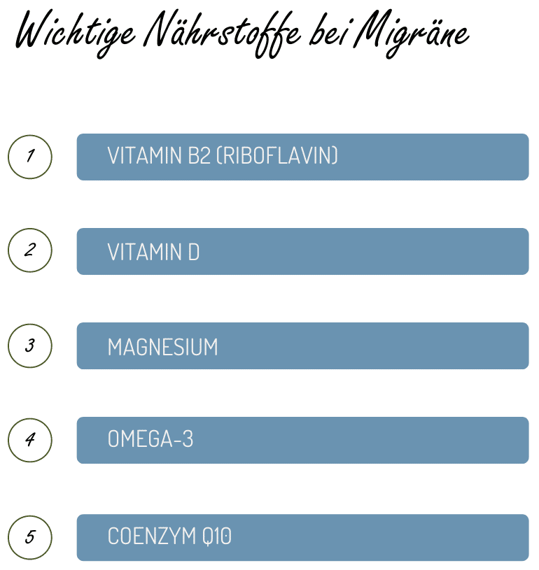 Neben den traditionellen Therapieansätzen zeigen aktuelle Studien, dass auch verschiedene Nährstoffe die Dauer, Intensität und Häufigkeit von Migräneattacken beeinflussen können. Wichtige Nährstoffe bei Migräne sind unter anderem Vitamin B2, Vitamin D, Coenzym-Q10 und Magnesium (siehe Infobox links). Auch Omega-3-Fettsäuren konnten in Studien eine positive Wirkung erzielen.