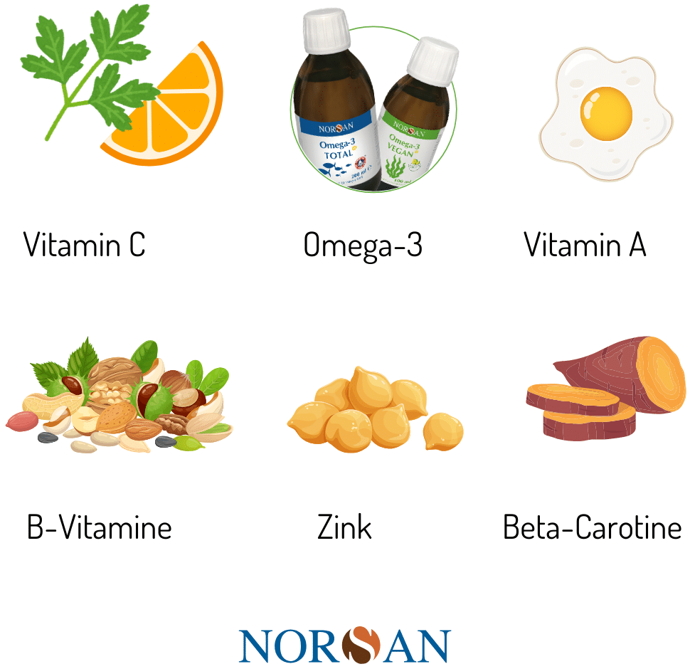 Viele Vitamine und Mineralstoffe haben einen bedeutenden Einfluss auf die Hautgesundheit. Insgesamt ist eine ausgewogene und bunte Ernährung wichtig, um die Haut mit allen notwendigen Nährstoffen zu versorgen. Besonders wichtig sind dabei.