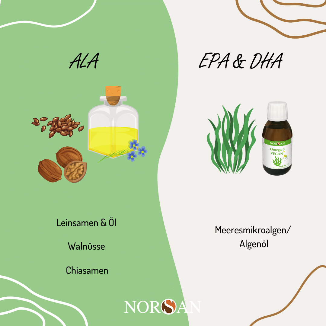 Die marinen Omega-3-Fettsäuren EPA (Eicosapentaensäure) und DHA (Docosahexaensäure) sind hauptsächlich in Meeresprodukten wie fetthaltigen Kaltwasserfischen, Krill und Krustentieren sowie speziellen marinen Algen zu finden. Da in der veganen und auch in der vegetarischen Ernährung kein Fisch gegessen wird, ist es wichtig, dass genügend EPA und DHA über pflanzliche Alternativen aufgenommen wird.