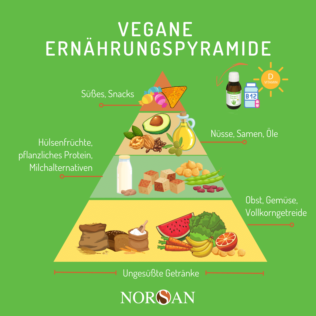 Diese vegane Ernährungspyramide spiegelt die empfohlenen Nahrungsmittelgruppen und Mengen wider, die in einer ausgewogenen veganen Ernährung berücksichtigt werden sollten.